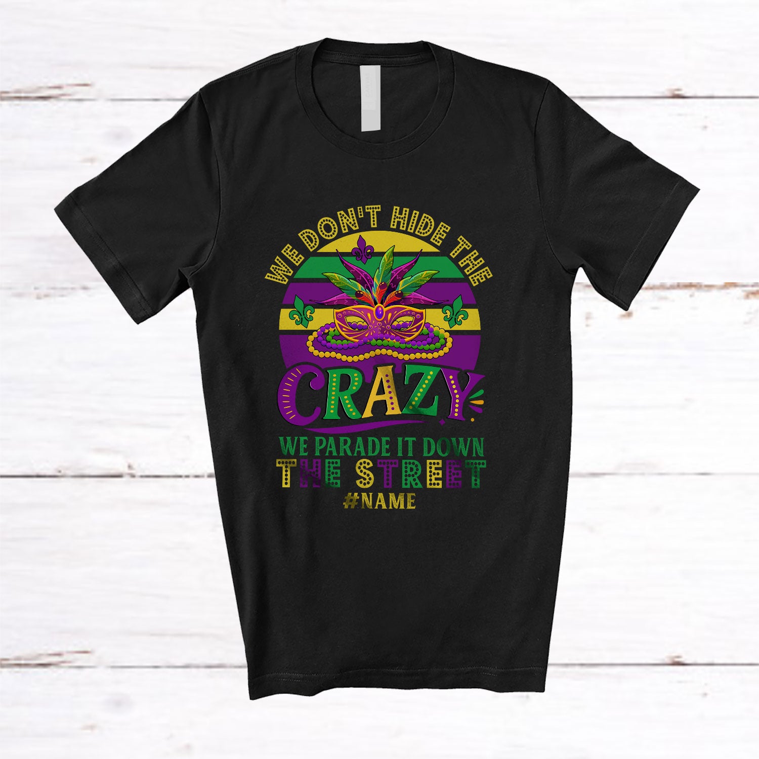 This Personalized Custom Name We Don't Hide The Crazy; Amazing Mardi Gras Mask Beads Parades; Retro T-Shirt is great idea gift for your family, friends in this birthday, christmas, mother's day, father's day, patrick's day or any holiday.