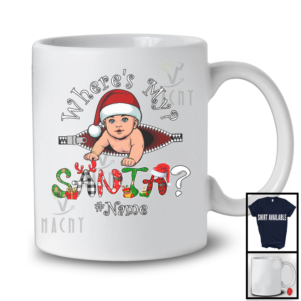 Personalized Custom Name Where's My Santa; Humorous Christmas Baby In Pocket; Pregnancy T-Shirt. This cotton t-shirt is a durable staple product with a classic fit. One of the most popular items, it has a relaxed style made for everyday and casual wear.