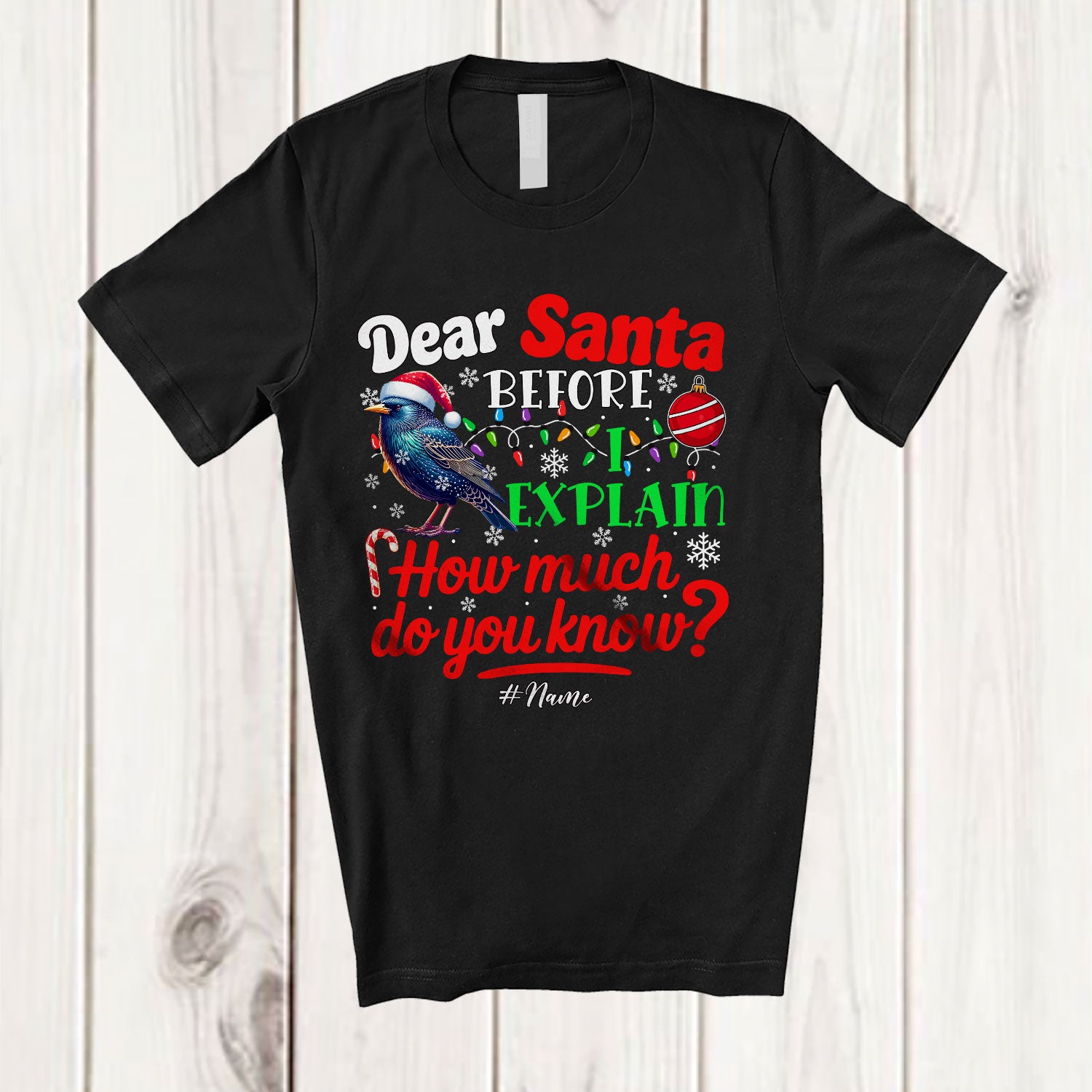 Personalized Dear Santa How Much Do You Know; Lovely Christmas Custom Name Santa Starling T-Shirt. This cotton t-shirt is a durable staple product with a classic fit. One of the most popular items, it has a relaxed style made for everyday and casual wear.