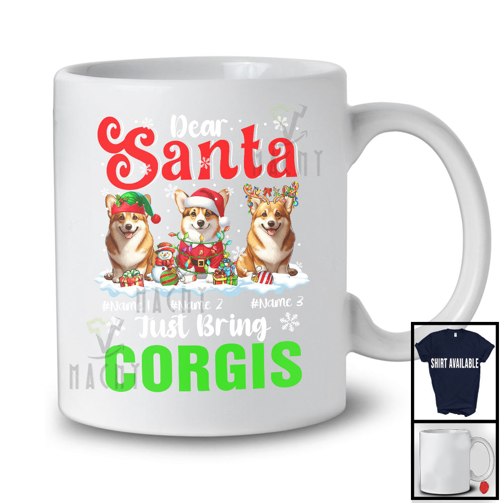 • Personalized Dear Santa Just Bring Corgis; Lovely Christmas Custom Name Snowing T-Shirt. This cotton t-shirt is a durable staple product with a classic fit. One of the most popular items, it has a relaxed style made for everyday and casual wear.