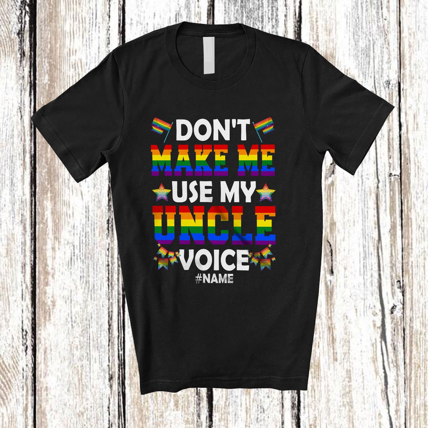 • Personalized Don't Make Me Use My Uncle Voice; Joyful LGBTQ Custom Name Gay; Rainbow Flag T-Shirt. This cotton t-shirt is a durable staple product with a classic fit. One of the most popular items, it has a relaxed style made for everyday and casual wear.