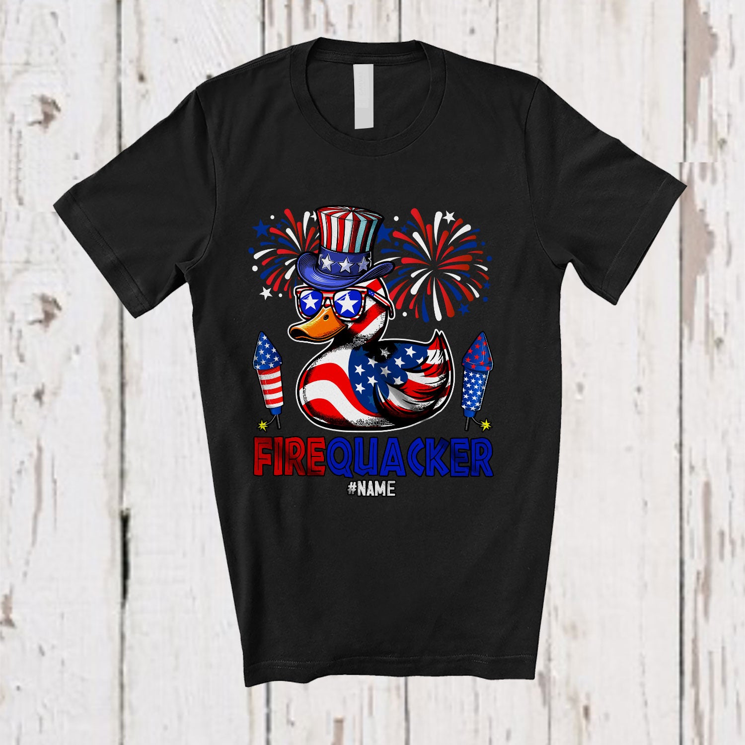 Personalized Firequacker; Humorous 4th Of July Duck Firecracker; Custom Name Patriotic Farmer T-Shirt. This cotton t-shirt is a durable staple product with a classic fit. One of the most popular items, it has a relaxed style made for everyday and casual wear.