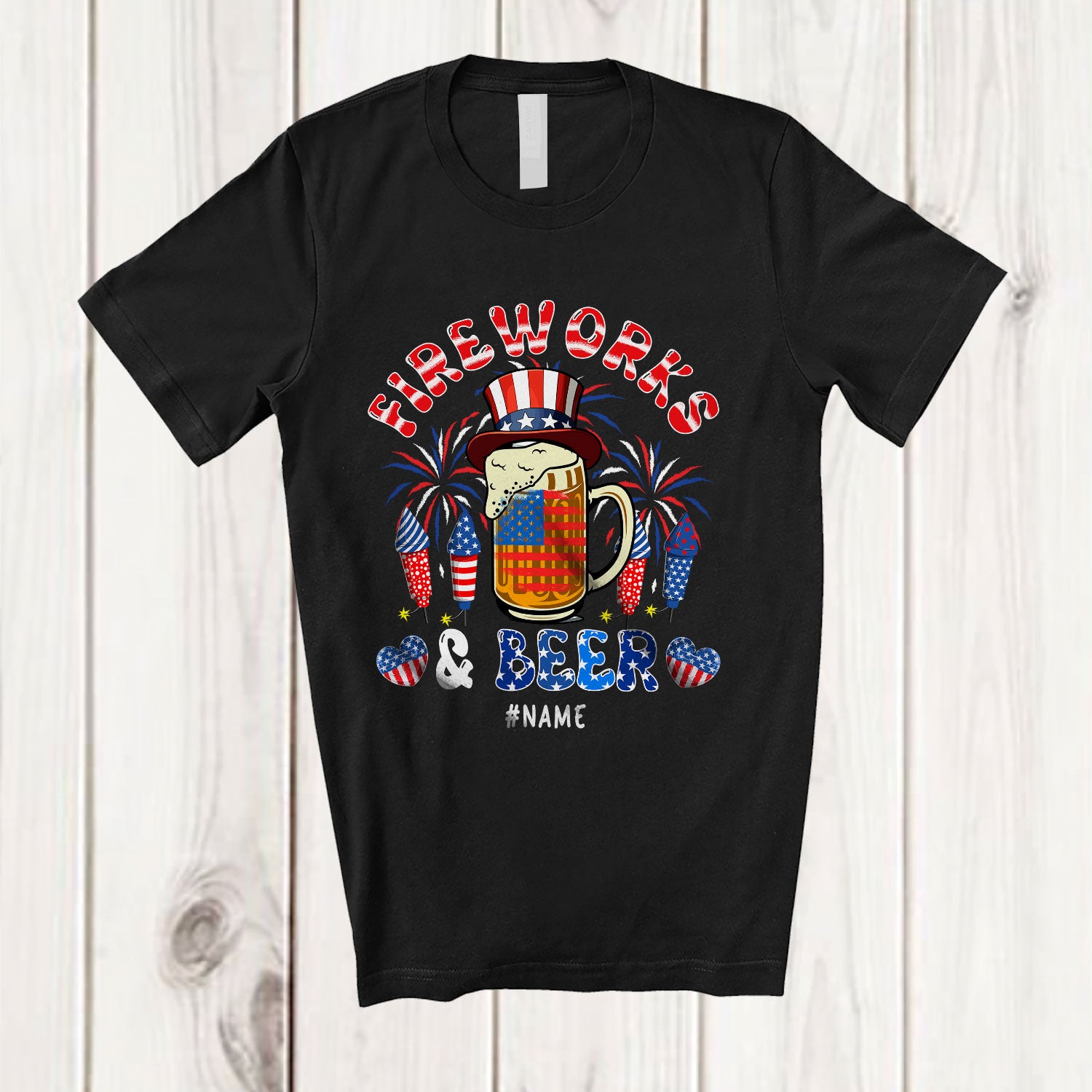 Personalized Fireworks and Beer; Cheerful 4th Of July Custom Name Drinking Drunker Patriotic T-Shirt