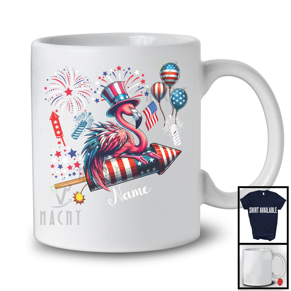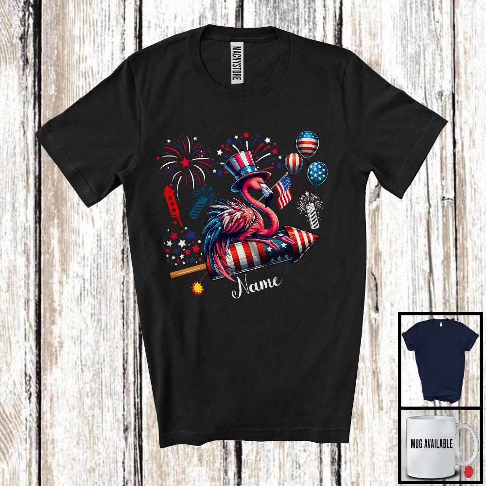 Personalized Flamingo Riding Firecracker, Lovely 4th Of July USA Flag Custom Name Flamingo Lover T-Shirt
