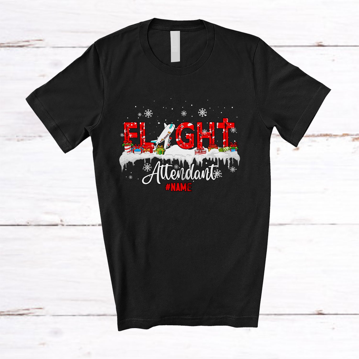• Personalized Flight Attendant; Amazing Christmas Plane Snowing; Custom Name Flight Attendant Santa T-Shirt. This cotton t-shirt is a durable staple product with a classic fit. One of the most popular items, it has a relaxed style made for everyday and casual wear.