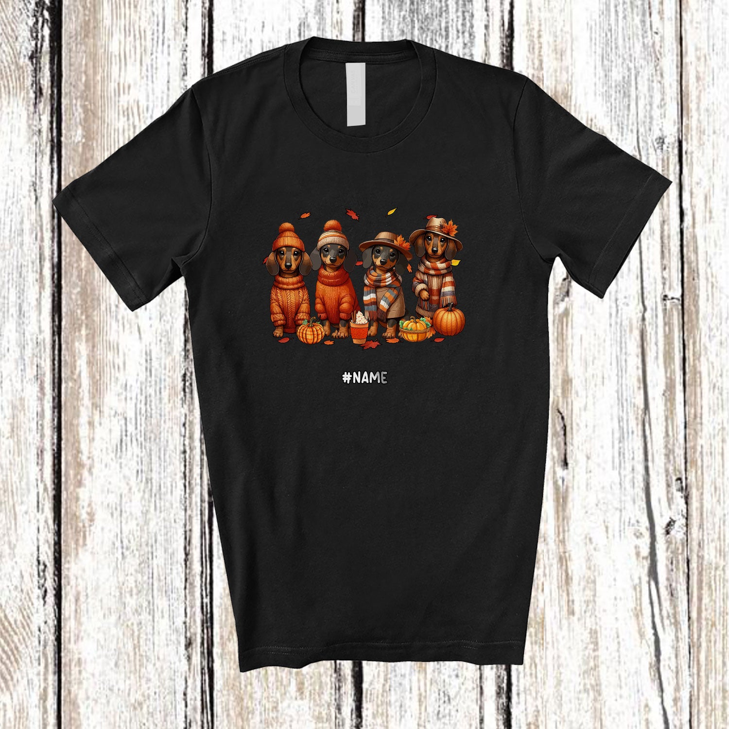• Personalized Four Dachshund Fall Leaves Pumpkin; Lovely Thanksgiving Dachshund Owner; Family T-Shirt. This cotton t-shirt is a durable staple product with a classic fit. One of the most popular items, it has a relaxed style made for everyday and casual wear.