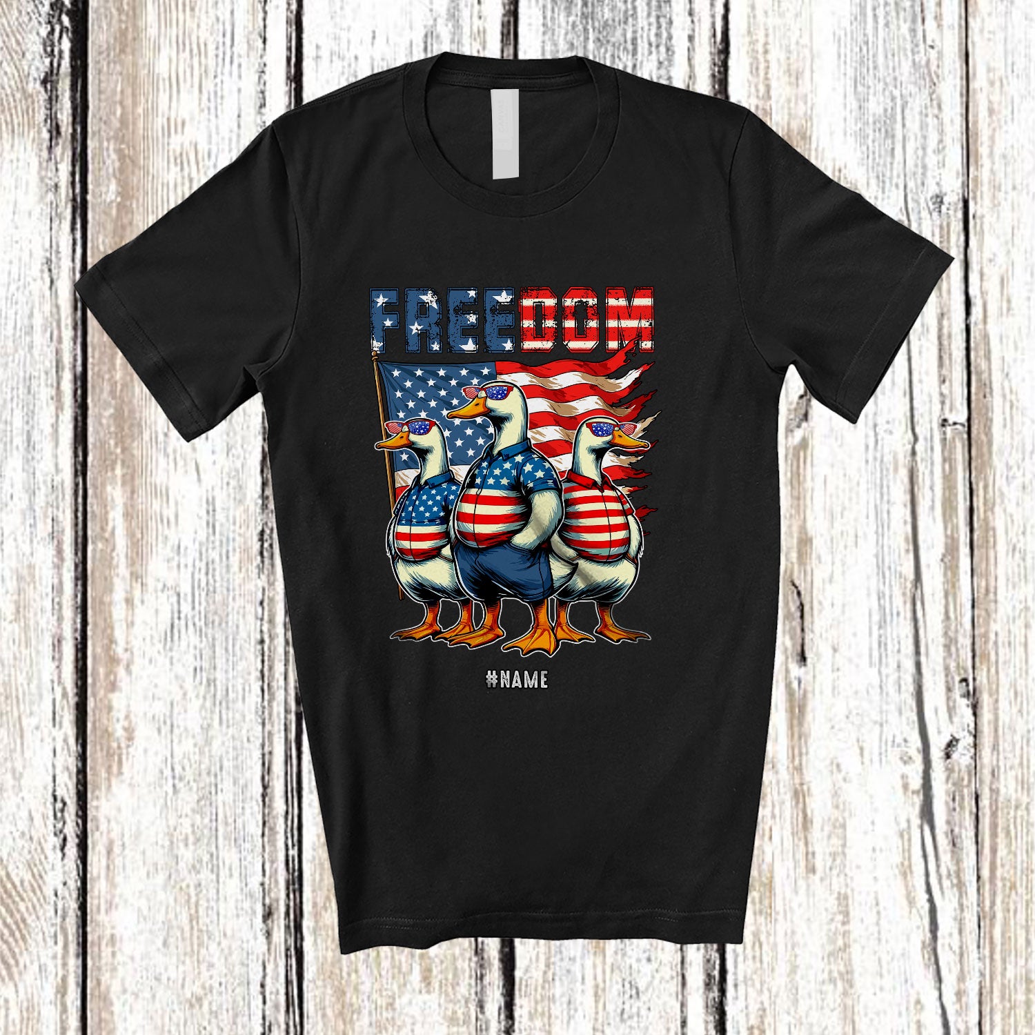 Personalized Freedom; Fantastic 4th of July Three US Flag Duck; Custom Name Farmer Patriotic T-Shirt
