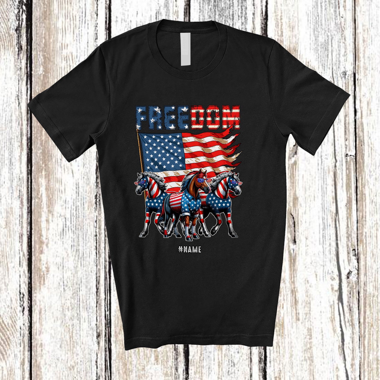 Personalized Freedom; Fantastic 4th of July Three US Flag Horse; Custom Name Farmer Patriotic T-Shirt