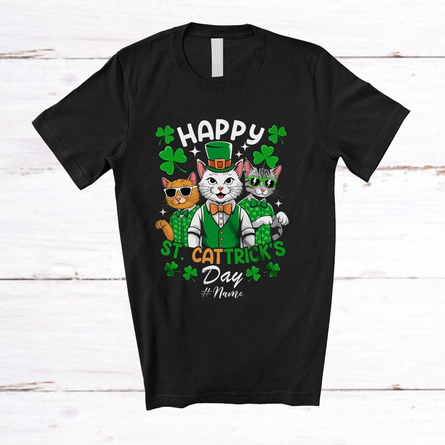 • Personalized Happy Cattrick's day; Fantastic St. Patrick's Three Custom Name Cat; Shamrocks T-Shirt. This cotton t-shirt is a durable staple product with a classic fit. One of the most popular items, it has a relaxed style made for everyday and casual wear.