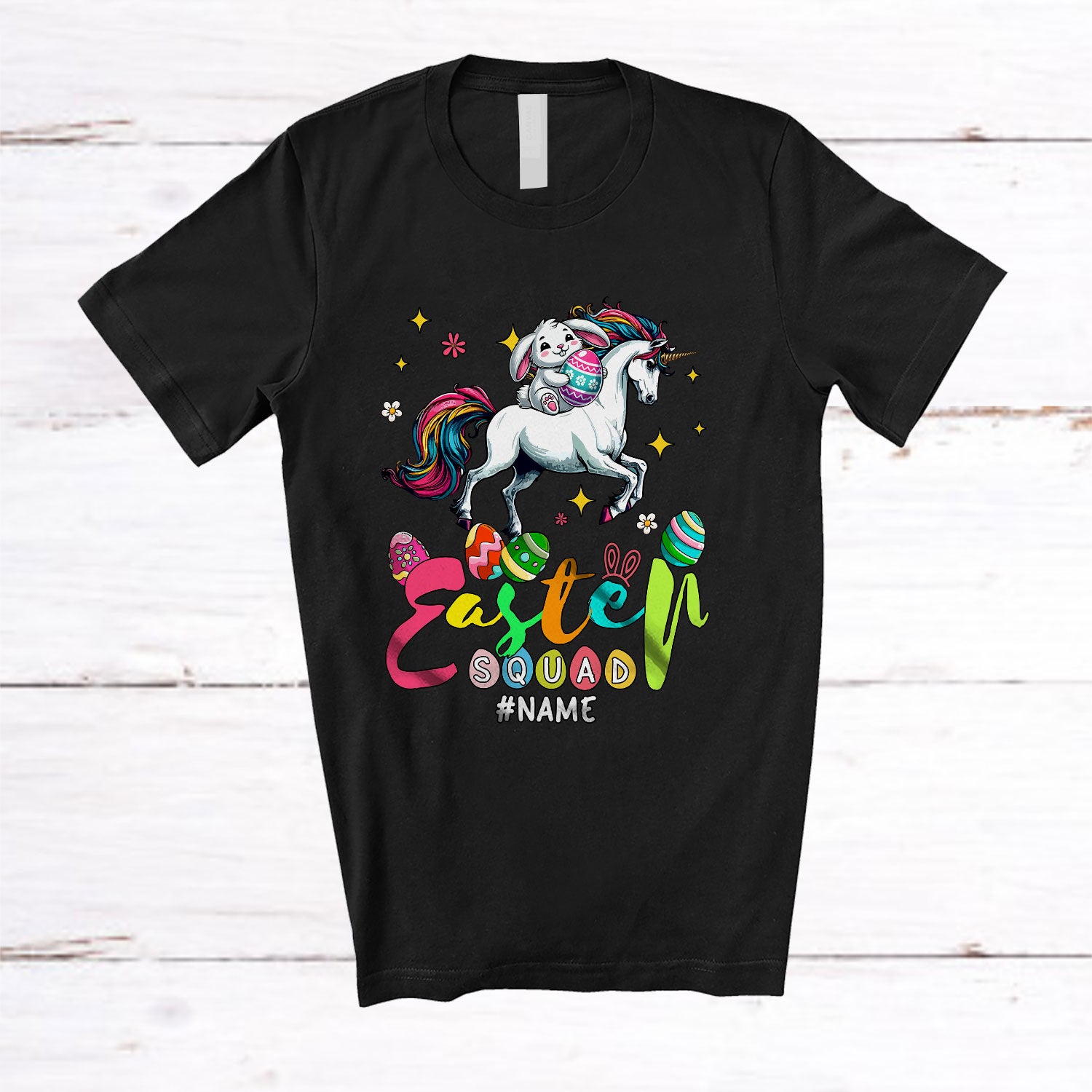 The Personalized Happy Easter; Adorable Custom Name Bunny Rabbit Riding Unicorn Eggs; Family T-Shirt destined to impress, and priced at only $12.95, for a limited time.