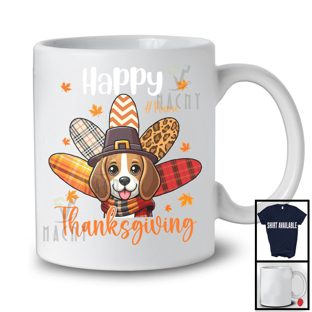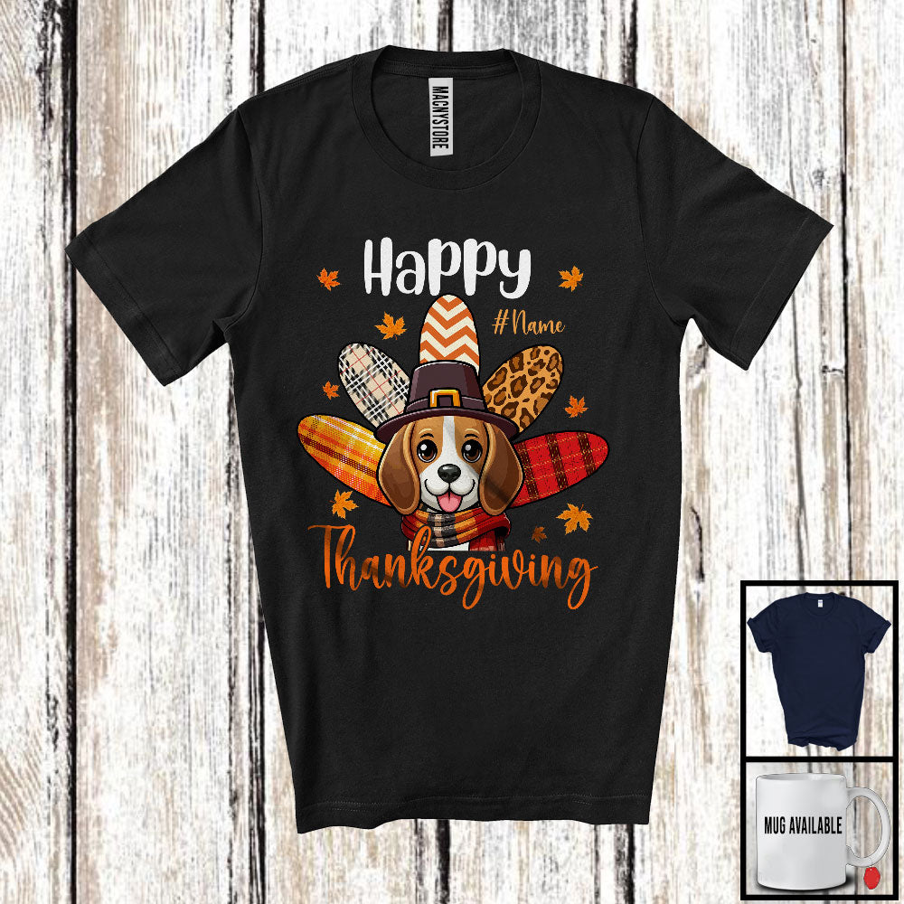 Personalized Happy Thanksgiving; Adorable Custom Name Beagle Plaid Turkey Tail; Family T-Shirt. This cotton t-shirt is a durable staple product with a classic fit. One of the most popular items, it has a relaxed style made for everyday and casual wear.