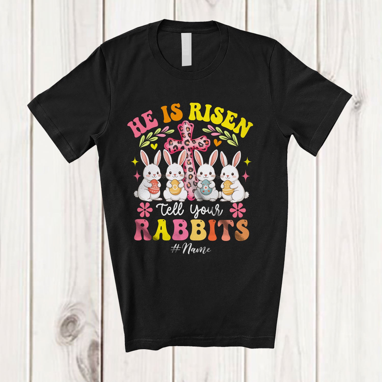 Personalized He is Risen Tell Your Rabbits; Joyful Easter Leopard Cross; Custom Name Egg Hunt T-Shirt