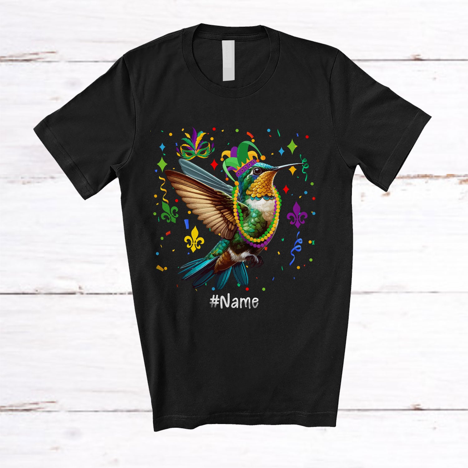 Personalized Hummingbird With Mardi Gras Beads Jester Hat; Lovely Custom Name Hummingbird T-Shirt. This cotton t-shirt is a durable staple product with a classic fit. One of the most popular items, it has a relaxed style made for everyday and casual wear.
