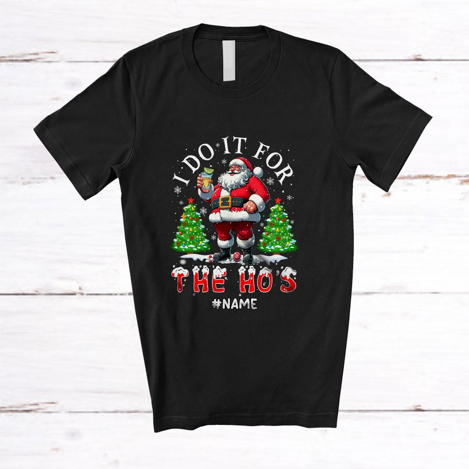 The Personalized I Do It For The Ho's; Cheerful Christmas Custom Name Santa Drinking Tequila; Drunker T-Shirt is far and away, one of our most popular items. People can't seem to get enough of it.