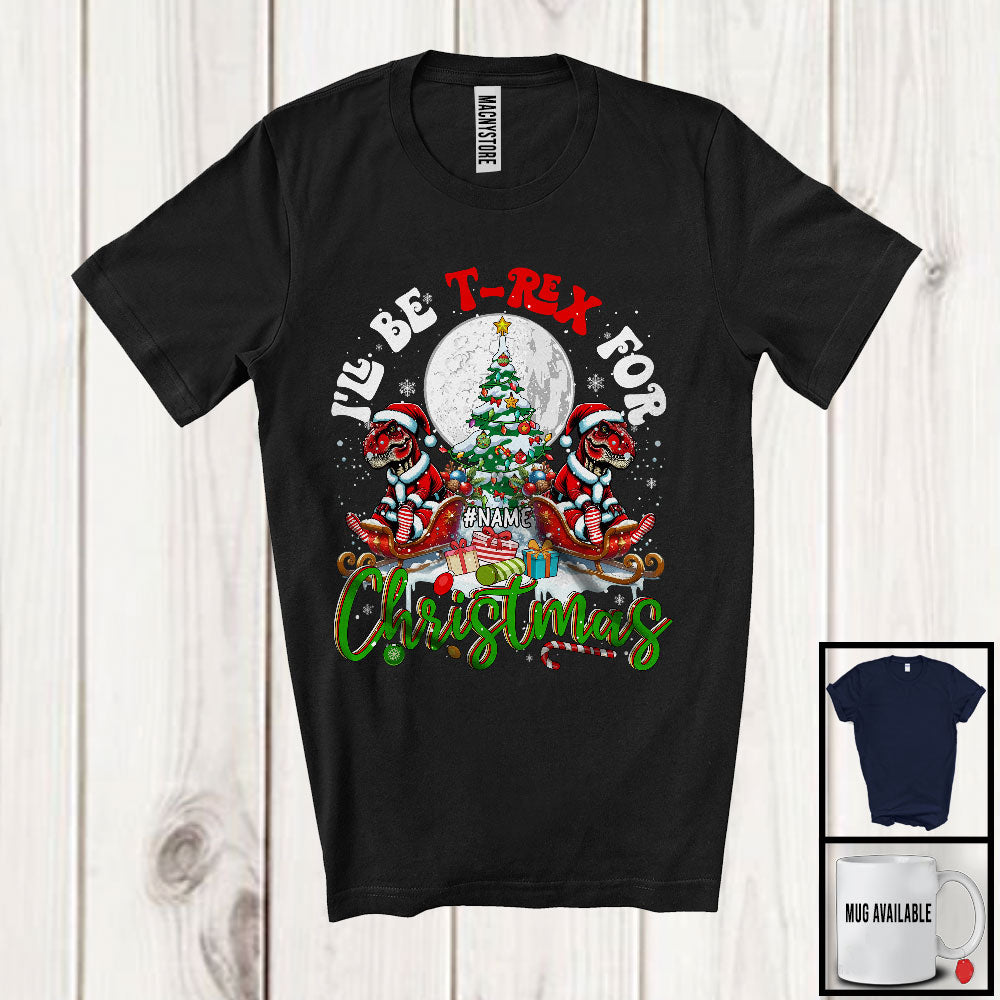 Personalized I'll Be T-Rex For Christmas, Merry X-mas Tree Lights Custom Name T-Rex, Snow T-Shirt. This cotton t-shirt is a durable staple product with a classic fit. One of the most popular items, it has a relaxed style made for everyday and casual wear.