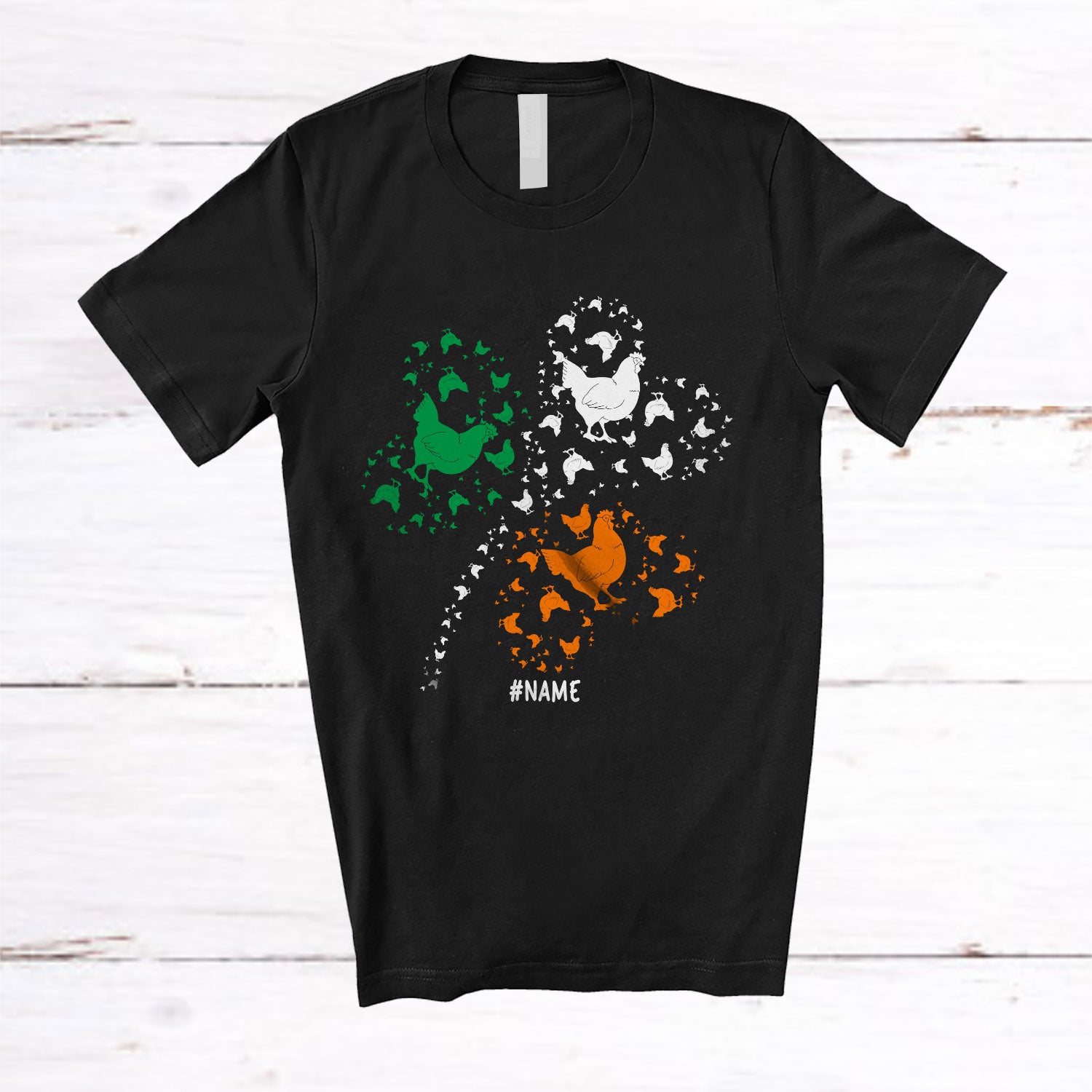 • Personalized Irish Chicken Shamrock Shape; Joyful St. Patrick's Day Custom Name Farmer; Family T-Shirt. This cotton t-shirt is a durable staple product with a classic fit. One of the most popular items, it has a relaxed style made for everyday and casual wear.