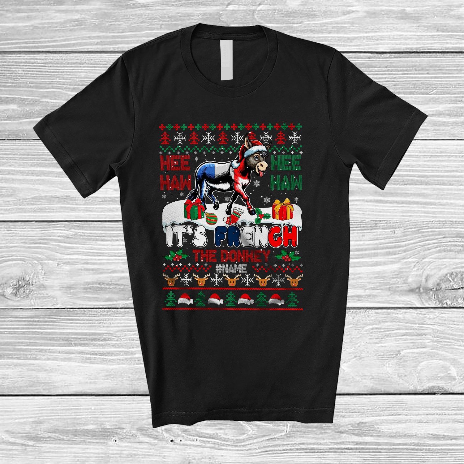 Personalized It's French The Donkey; Amazing Christmas Sweater; Custom Name Santa Donkey T-Shirt. This cotton t-shirt is a durable staple product with a classic fit. One of the most popular items, it has a relaxed style made for everyday and casual wear.