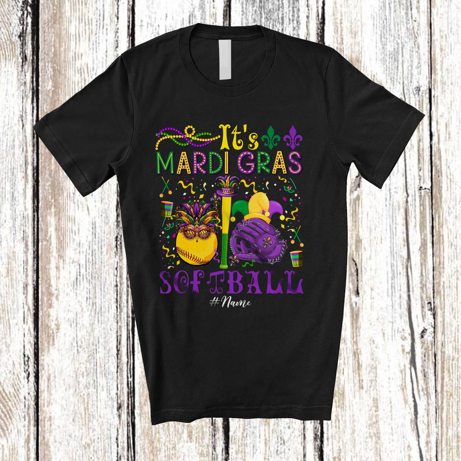 Personalized It's Mardi Gras Softball; Lovely Beads Custom Name Softball Player; Family T-Shirt