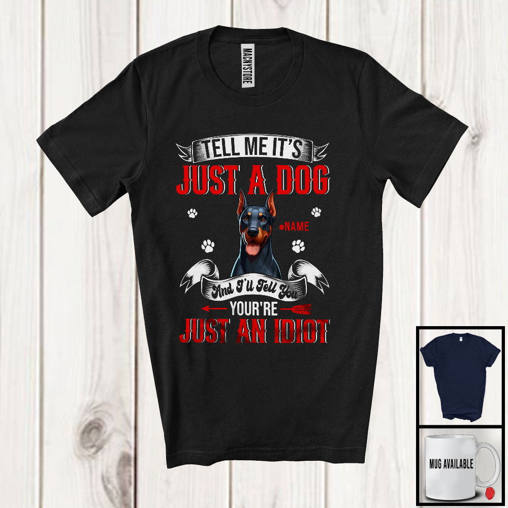 This Personalized Just A Dog You're Just An Idiot; Humorous Custom Name Doberman Owner T-Shirt is great idea gift for your family, friends in this birthday, christmas, mother's day, father's day, patrick's day or any holiday.