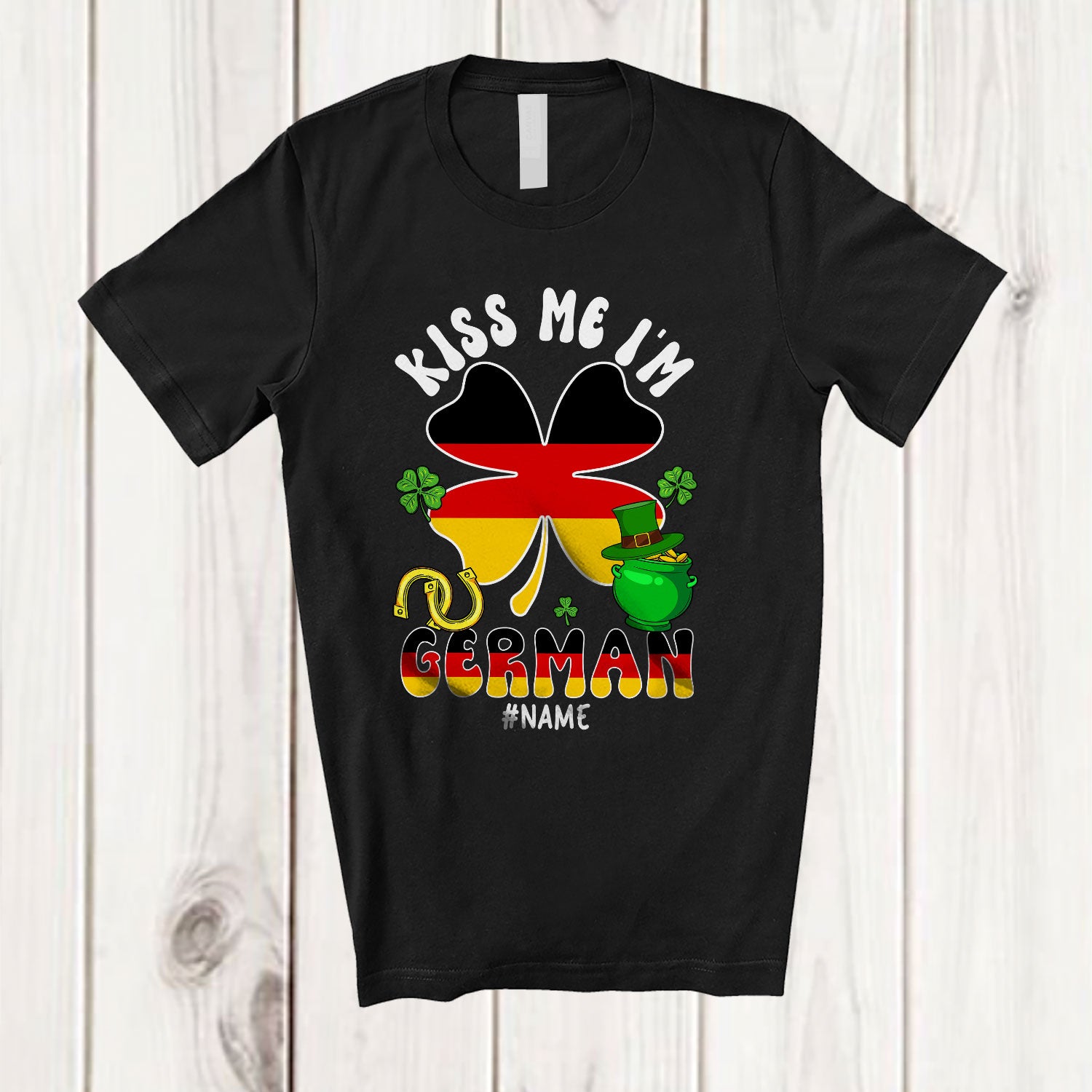 • Personalized Kiss Me I'm German; Fantastic St. Patrick's Day Custom Name German Flag Shamrock T-Shirt. This cotton t-shirt is a durable staple product with a classic fit. One of the most popular items, it has a relaxed style made for everyday and casual wear.