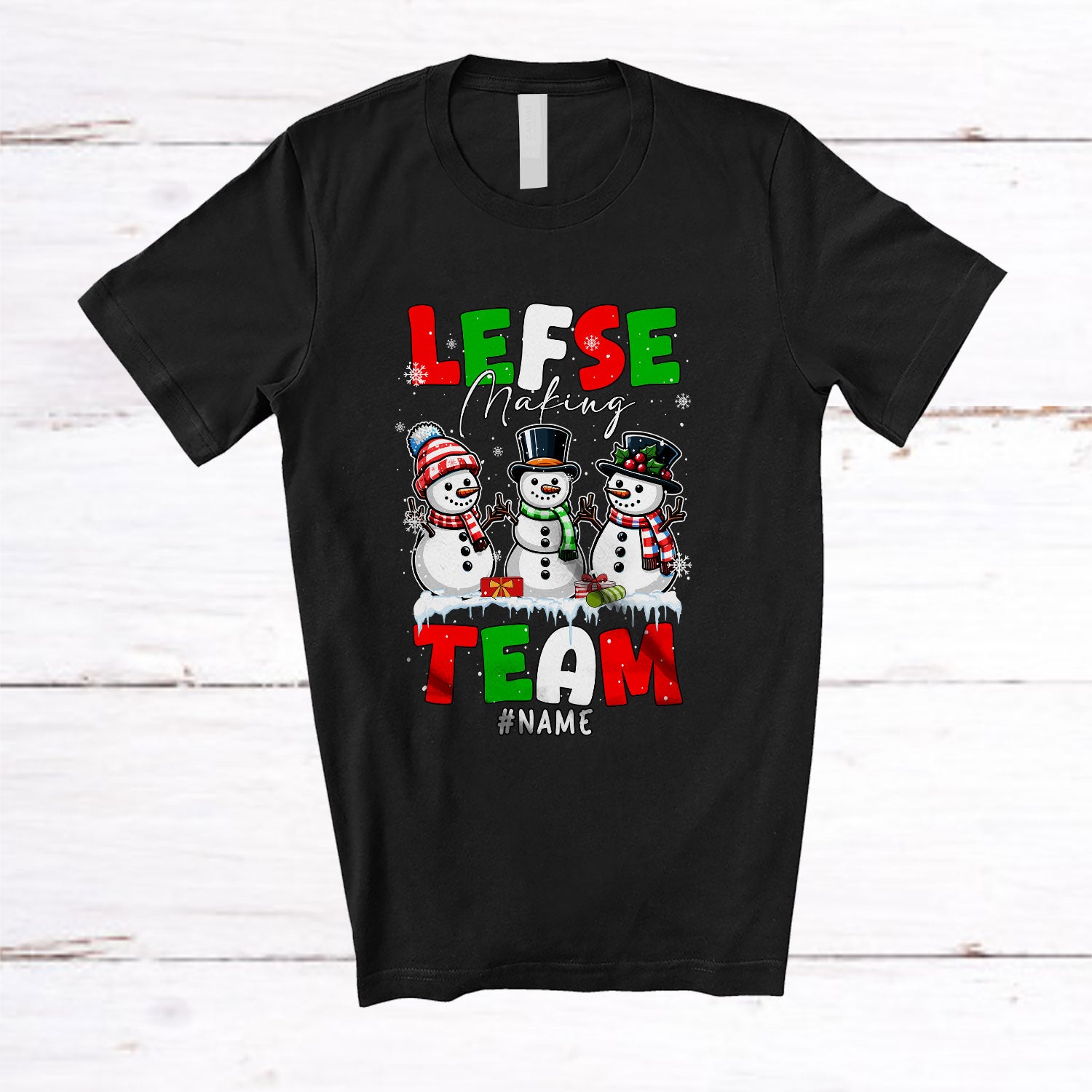 Personalized Lefse Making Team; Amusing Christmas Snow Three Snowman; Custom Name Baking T-Shirt. This cotton t-shirt is a durable staple product with a classic fit. One of the most popular items, it has a relaxed style made for everyday and casual wear.