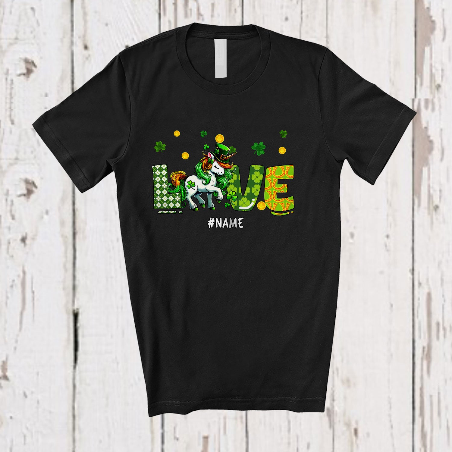 Personalized Love; Adorable St Patrick's Day Custom Name Unicorn Holding Shamrock; Family T-Shirt