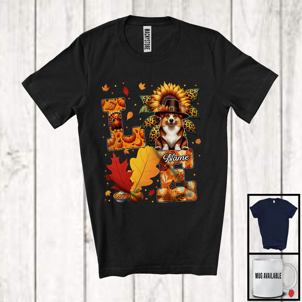 new MacnyStore - Personalized LOVE, Adorable Thanksgiving Custom Name Corgi, Sunflower Fall Leaves T-Shirt – Macnystore