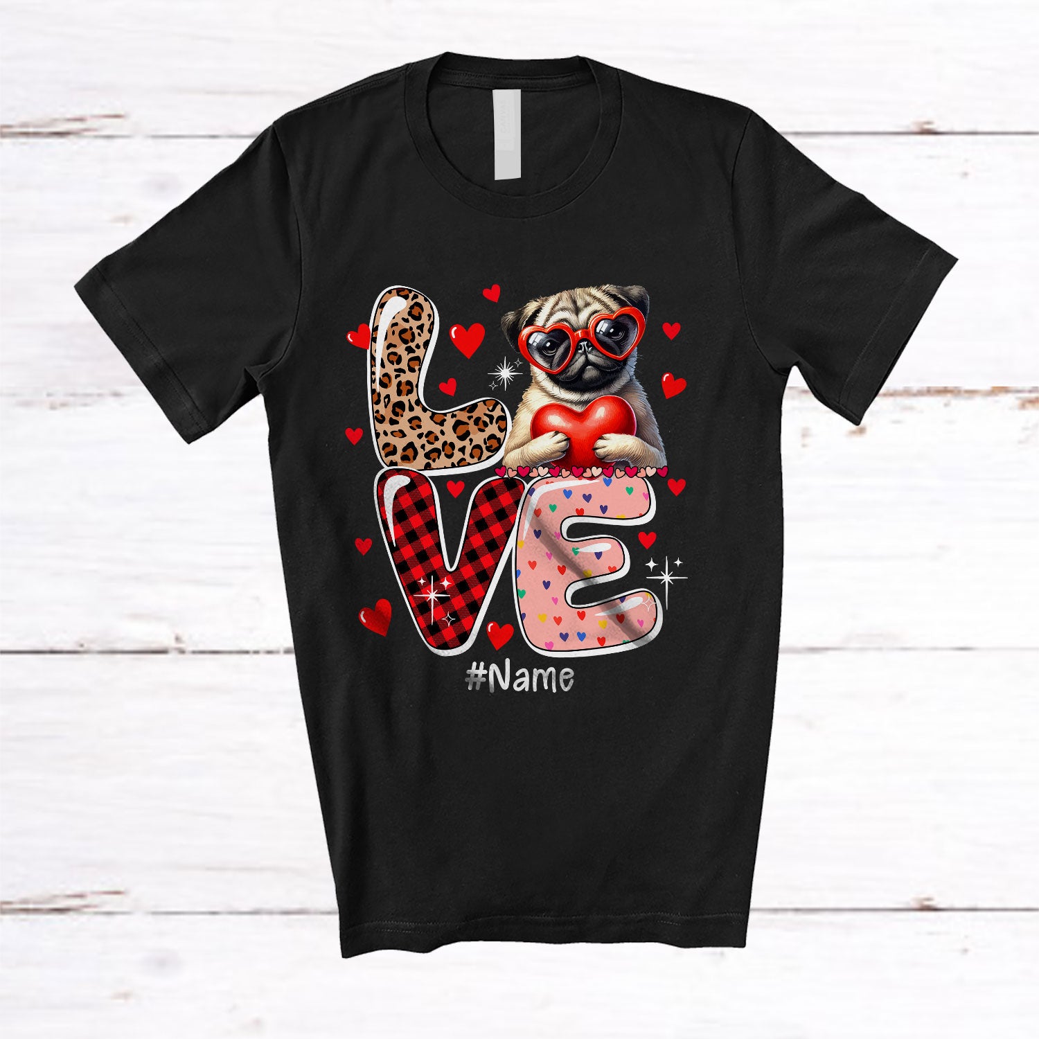 Personalized LOVE; Adorable Valentine Custom Name Pug Holding Heart; Leopard Plaid T-Shirt. This cotton t-shirt is a durable staple product with a classic fit. One of the most popular items, it has a relaxed style made for everyday and casual wear.