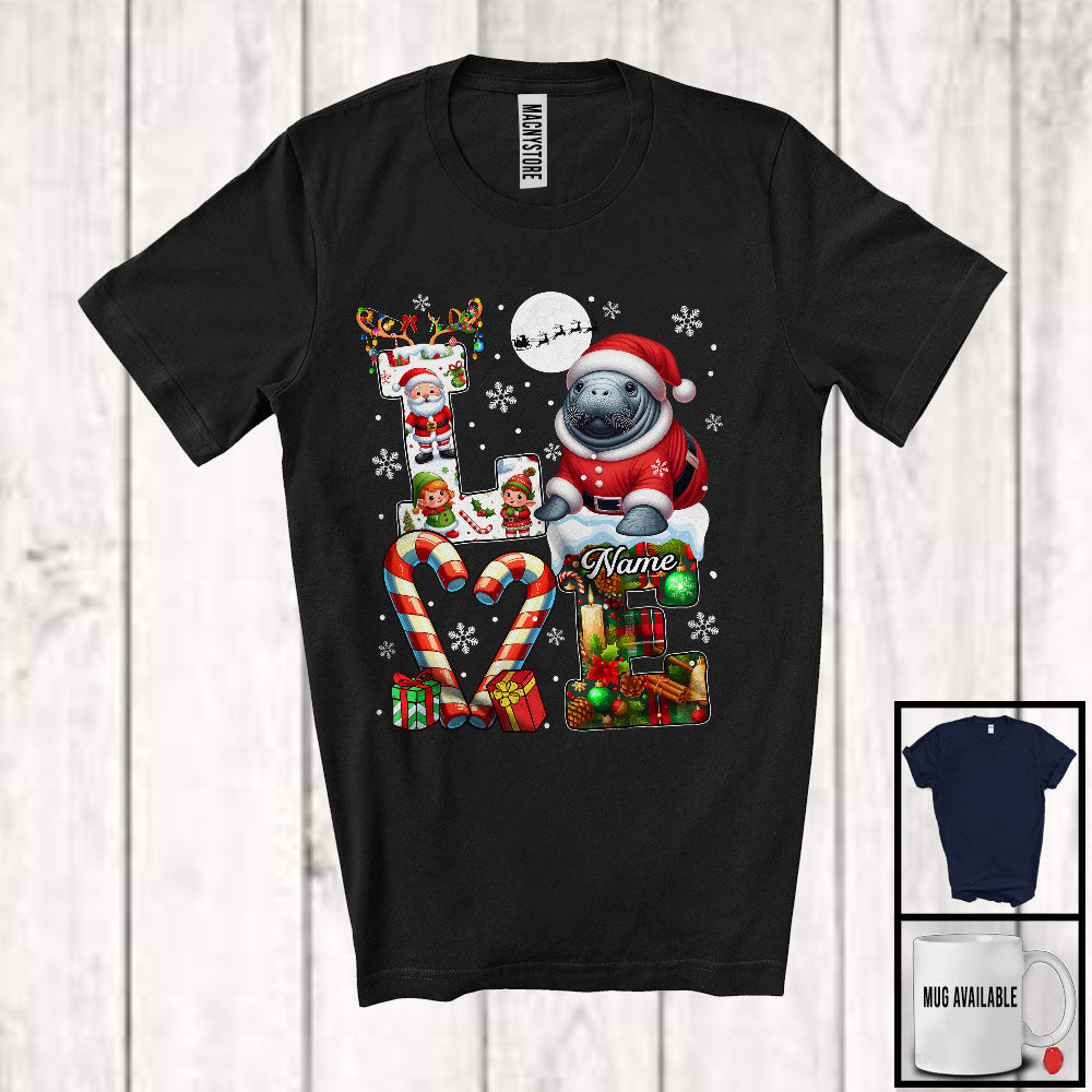 Personalized LOVE, Awesome Christmas Custom Name Manatee Santa, Candy Cane Plaid Animal T-Shirt
