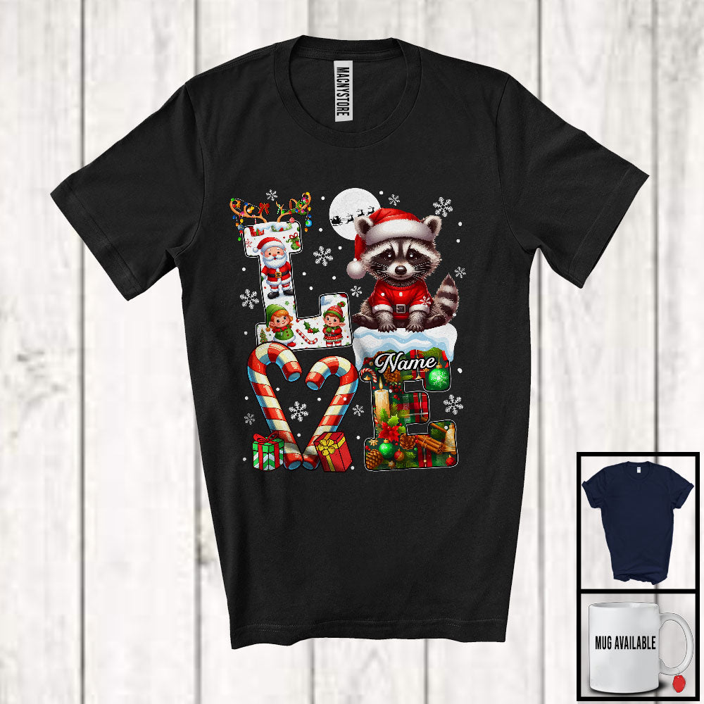 Personalized LOVE, Awesome Christmas Custom Name Raccoon Santa, Candy Cane Plaid Animal T-Shirt