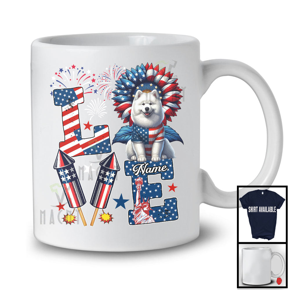Personalized Love, Lovely 4th Of July Custom Name Samoyed, Sunflower US Flag Patriotic T-Shirt. This cotton t-shirt is a durable staple product with a classic fit. One of the most popular items, it has a relaxed style made for everyday and casual wear.