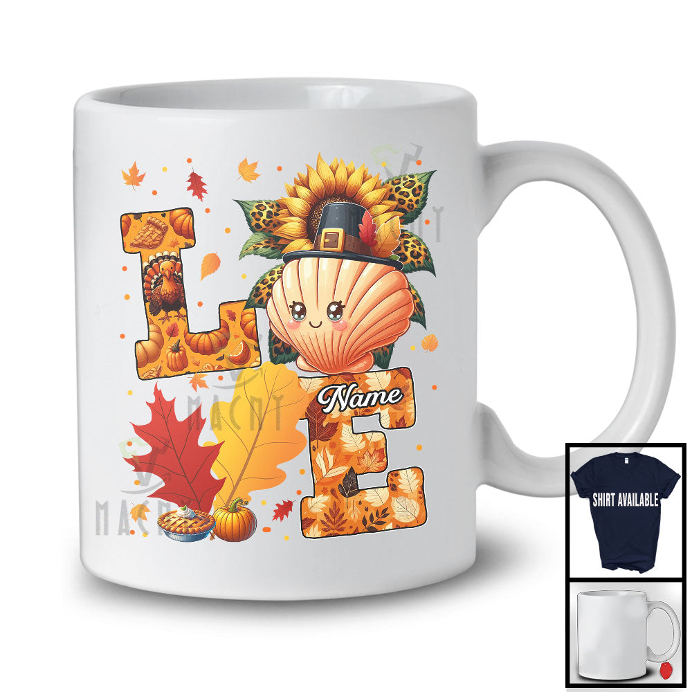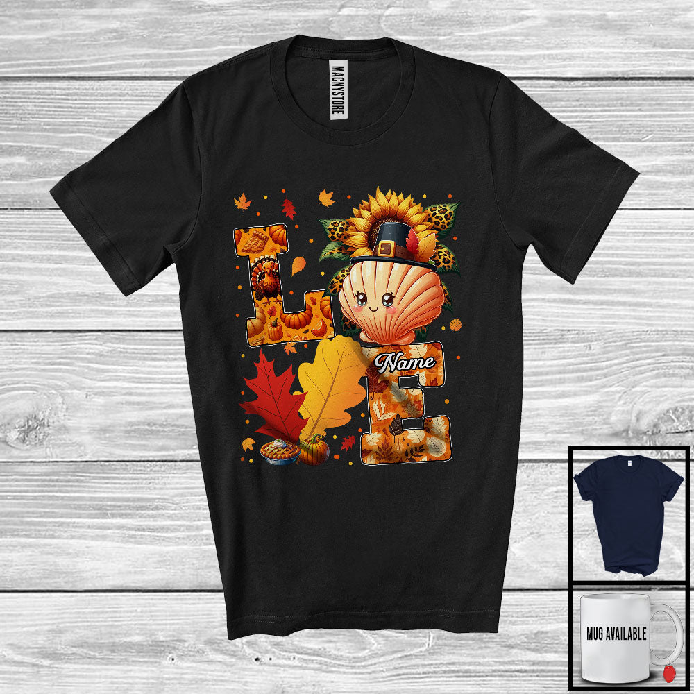 This Personalized LOVE; Lovely Thanksgiving Custom Name Scallop; Leopard Sunflowers Fall Leaves T-Shirt is great idea gift for your family, friends in this birthday, christmas, mother's day, father's day, patrick's day or any holiday.