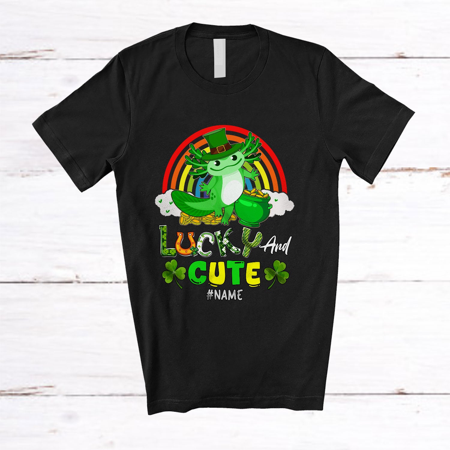 • Personalized Lucky And Cute; Lovely St. Patrick's Day Custom Name Axolotl; Shamrocks Rainbow T-Shirt. This cotton t-shirt is a durable staple product with a classic fit. One of the most popular items, it has a relaxed style made for everyday and casual wear.