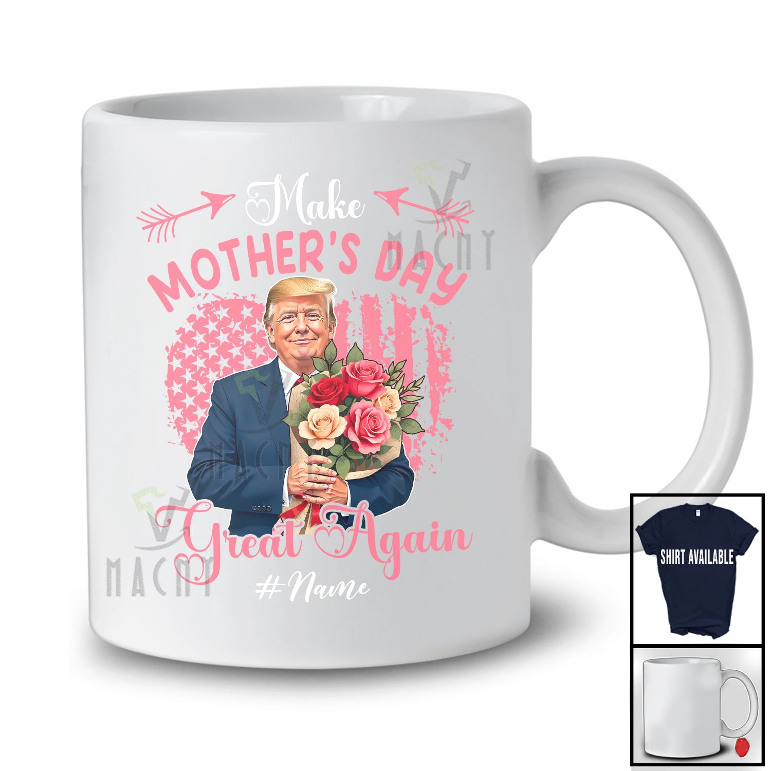 Personalized Make Mother's Day Great Again; Humorous US Flag Trump; Custom Name Family T-Shirt. This cotton t-shirt is a durable staple product with a classic fit. One of the most popular items, it has a relaxed style made for everyday and casual wear.