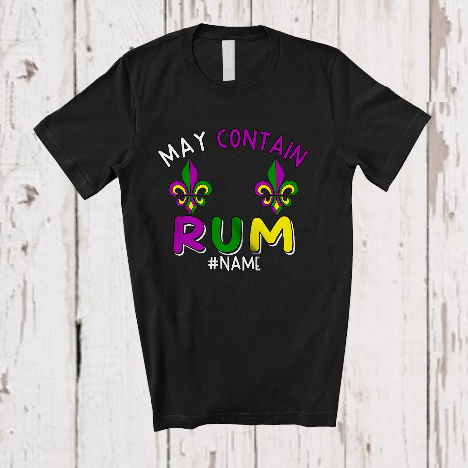 • Personalized May Contain Rum; Joyful Mardi Gras Custom Name Women; Bra Fake Drinking T-Shirt. This cotton t-shirt is a durable staple product with a classic fit. One of the most popular items, it has a relaxed style made for everyday and casual wear.
