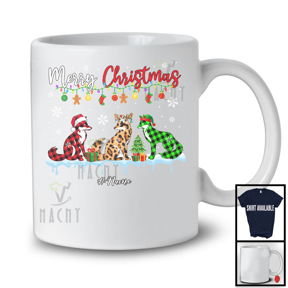 Personalized Merry Christmas; Adorable X-mas Three Leopard Plaid Fox; Custom Name Animal T-Shirt
