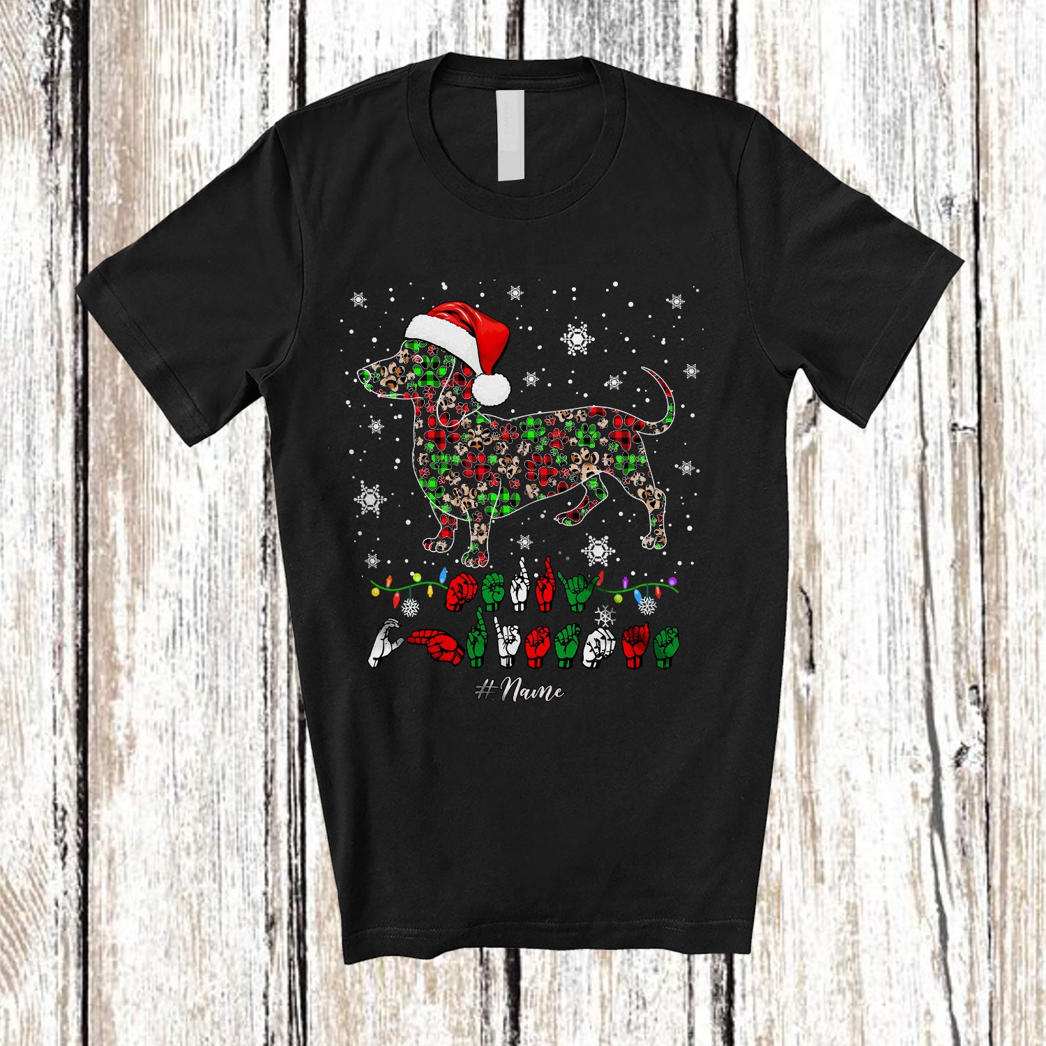 Personalized Merry Christmas ASL; Lovely Custom Name Santa Dachshund Paws Shape; Sign Language T-Shirt