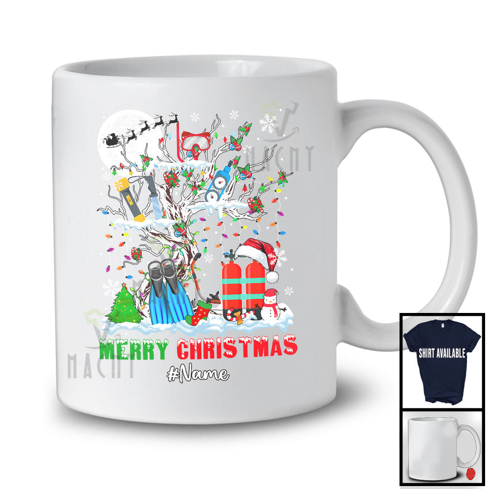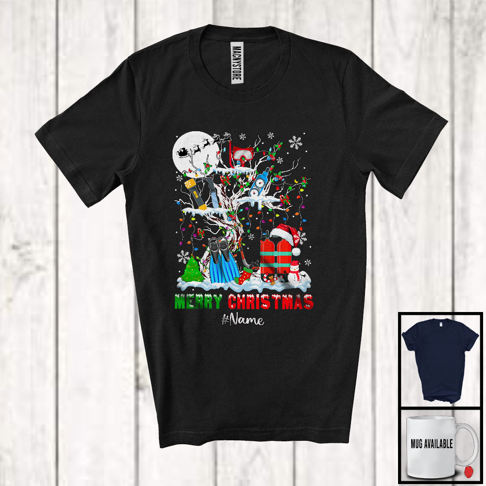Personalized Merry Christmas; Fantastic Custom Name Scuba Diver Tools On X-mas Tree Lights T-Shirt