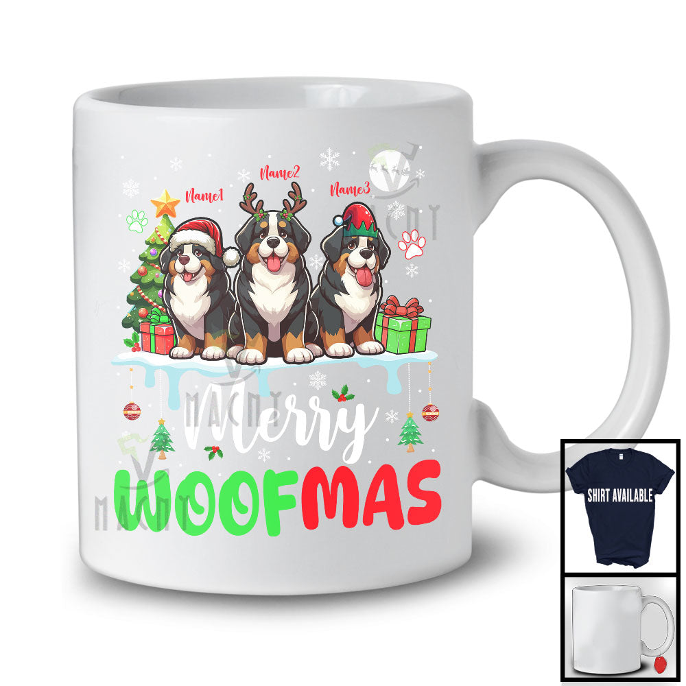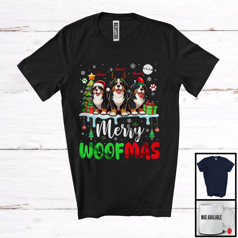 Personalized Merry Woofmas; Awesome Christmas Custom Name Three Bernese Mountain; Snow T-Shirt