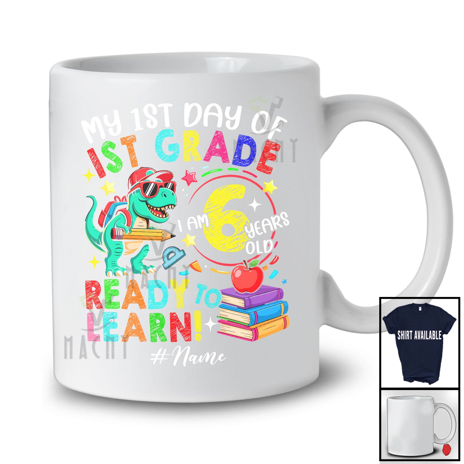 • Personalized My 1st Day Of 1st Grade; Lovely First Day Back To School Custom Name T-Rex T-Shirt. This cotton t-shirt is a durable staple product with a classic fit. One of the most popular items, it has a relaxed style made for everyday and casual wear.