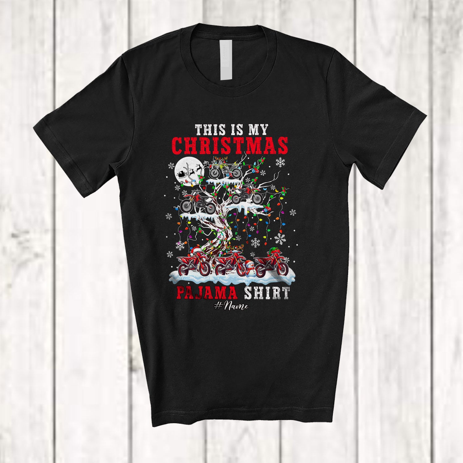 Personalized My Christmas Pajama Shirt; Fantastic Custom Name Dirt Bike On X-mas Tree; Biker T-Shirt. This cotton t-shirt is a durable staple product with a classic fit. One of the most popular items, it has a relaxed style made for everyday and casual wear.