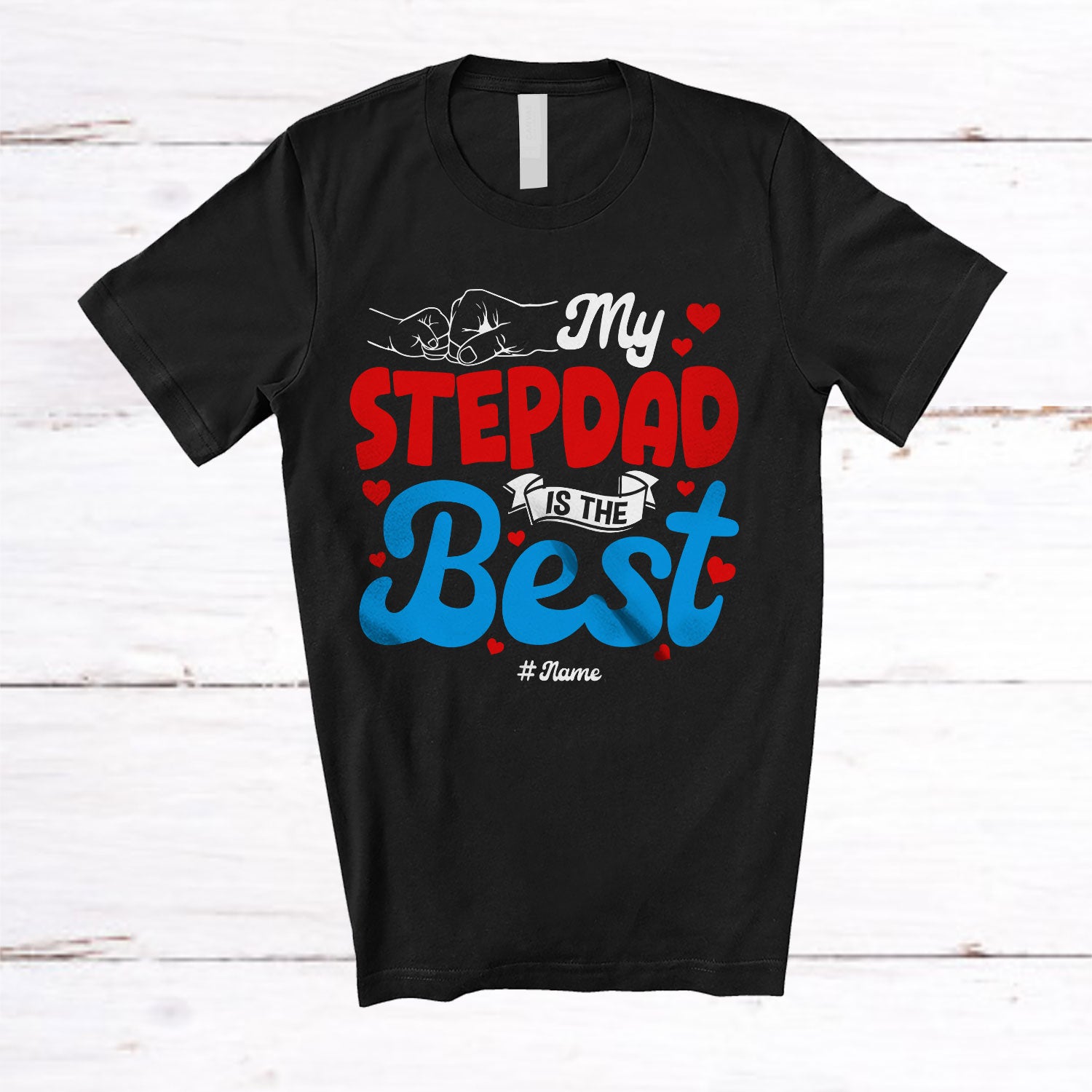 • Personalized My Stepdad Is The Best; Amusing Father's Day Hearts Hands; Custom Name Family T-Shirt. This cotton t-shirt is a durable staple product with a classic fit. One of the most popular items, it has a relaxed style made for everyday and casual wear.