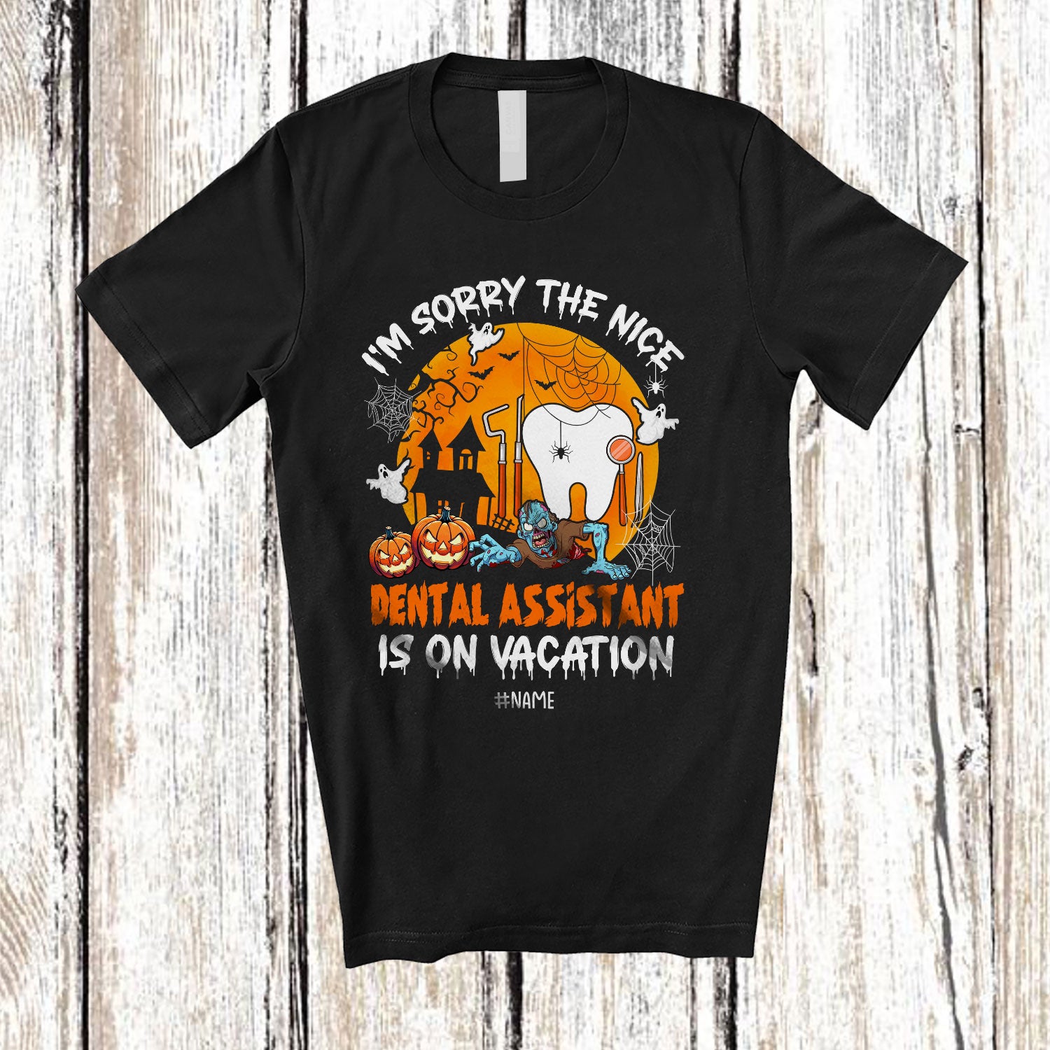 Personalized Nice Dental Assistant Is On Vacation; Joyful Halloween Zombie Pumpkin; Custom Name Jobs T-Shirt. This cotton t-shirt is a durable staple product with a classic fit. One of the most popular items, it has a relaxed style made for everyday and casual wear.