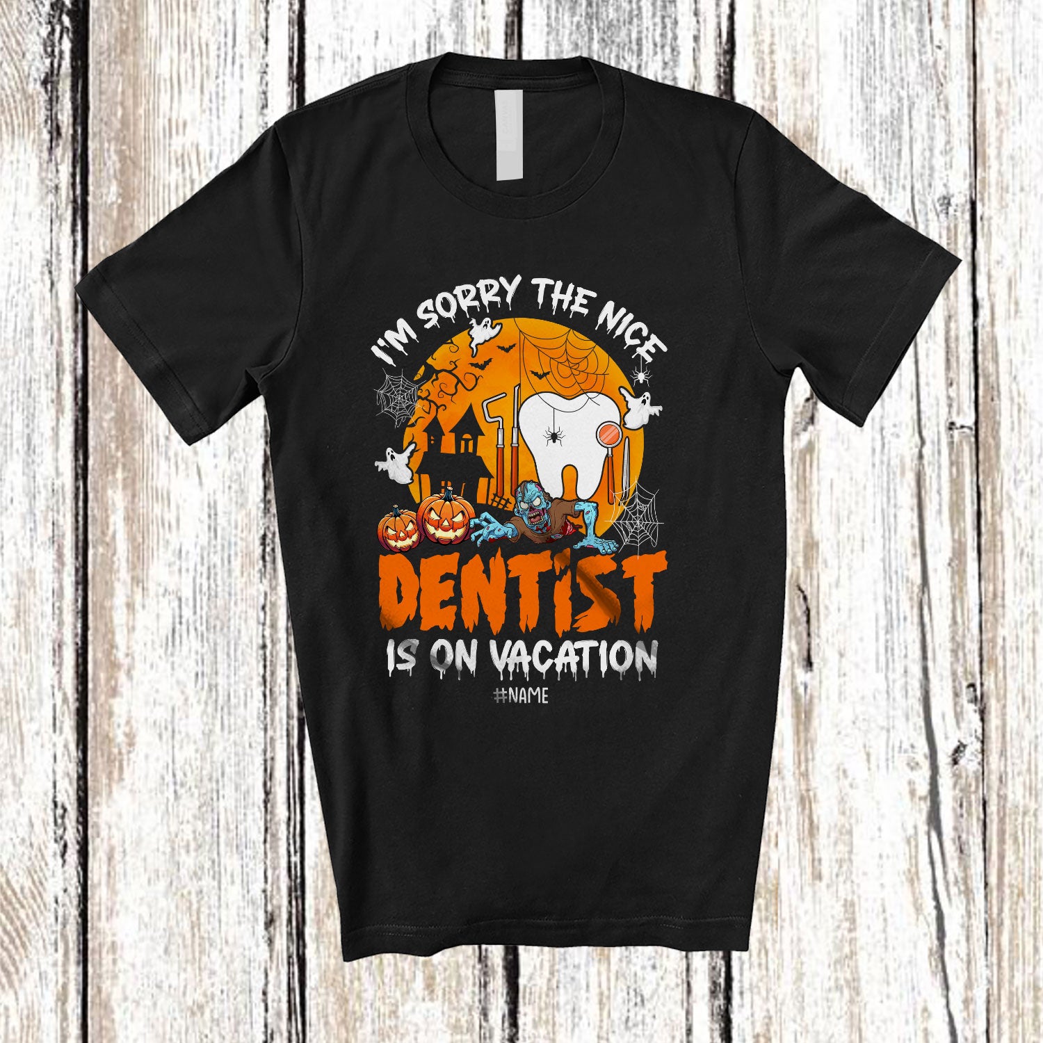 Personalized Nice Dentist Is On Vacation; Joyful Halloween Zombie Pumpkin; Custom Name Jobs T-Shirt. This cotton t-shirt is a durable staple product with a classic fit. One of the most popular items, it has a relaxed style made for everyday and casual wear.