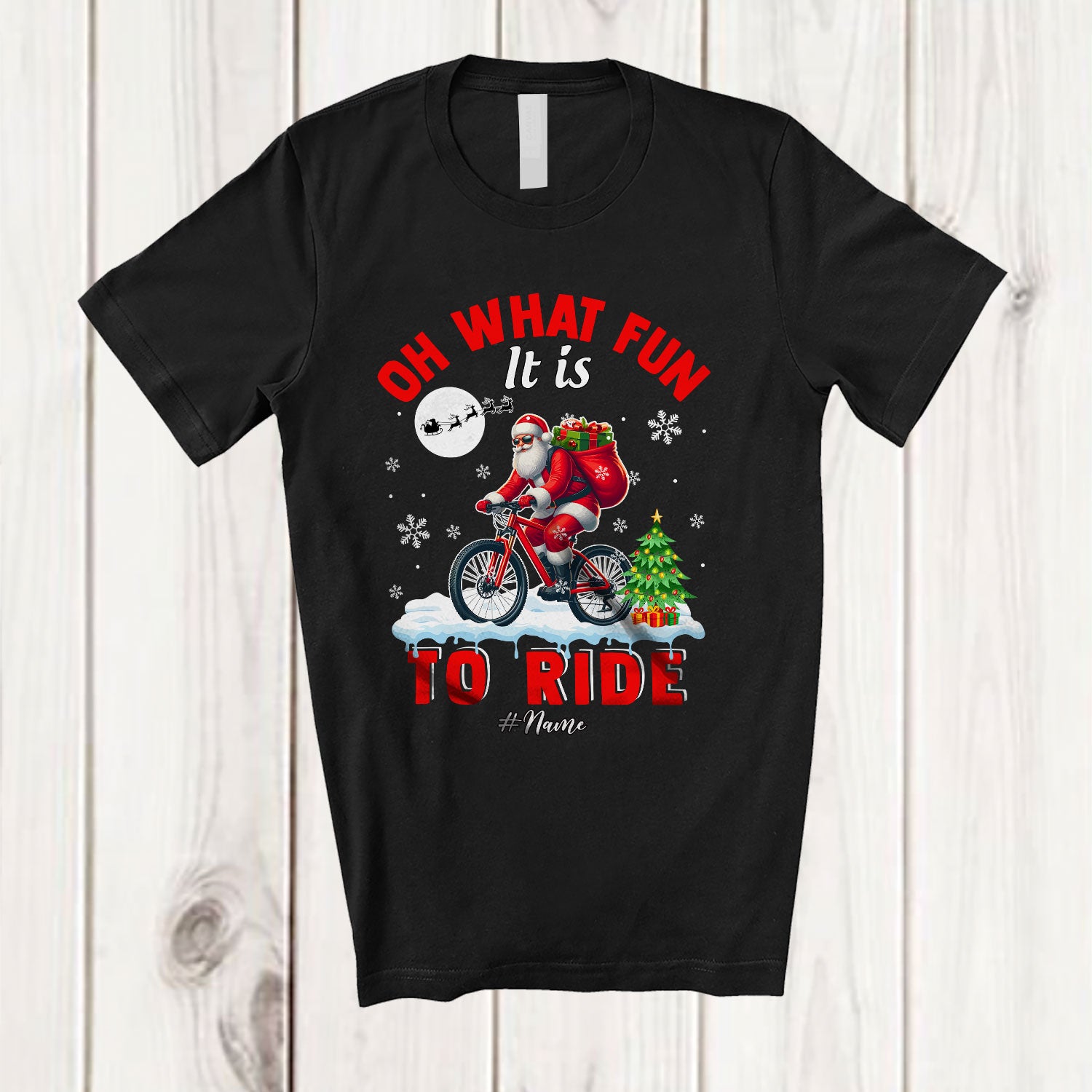 Personalized Oh What Fun It is To Ride; Amusing Christmas Santa Bicycle; Custom Name Rider T-Shirt. This cotton t-shirt is a durable staple product with a classic fit. One of the most popular items, it has a relaxed style made for everyday and casual wear.