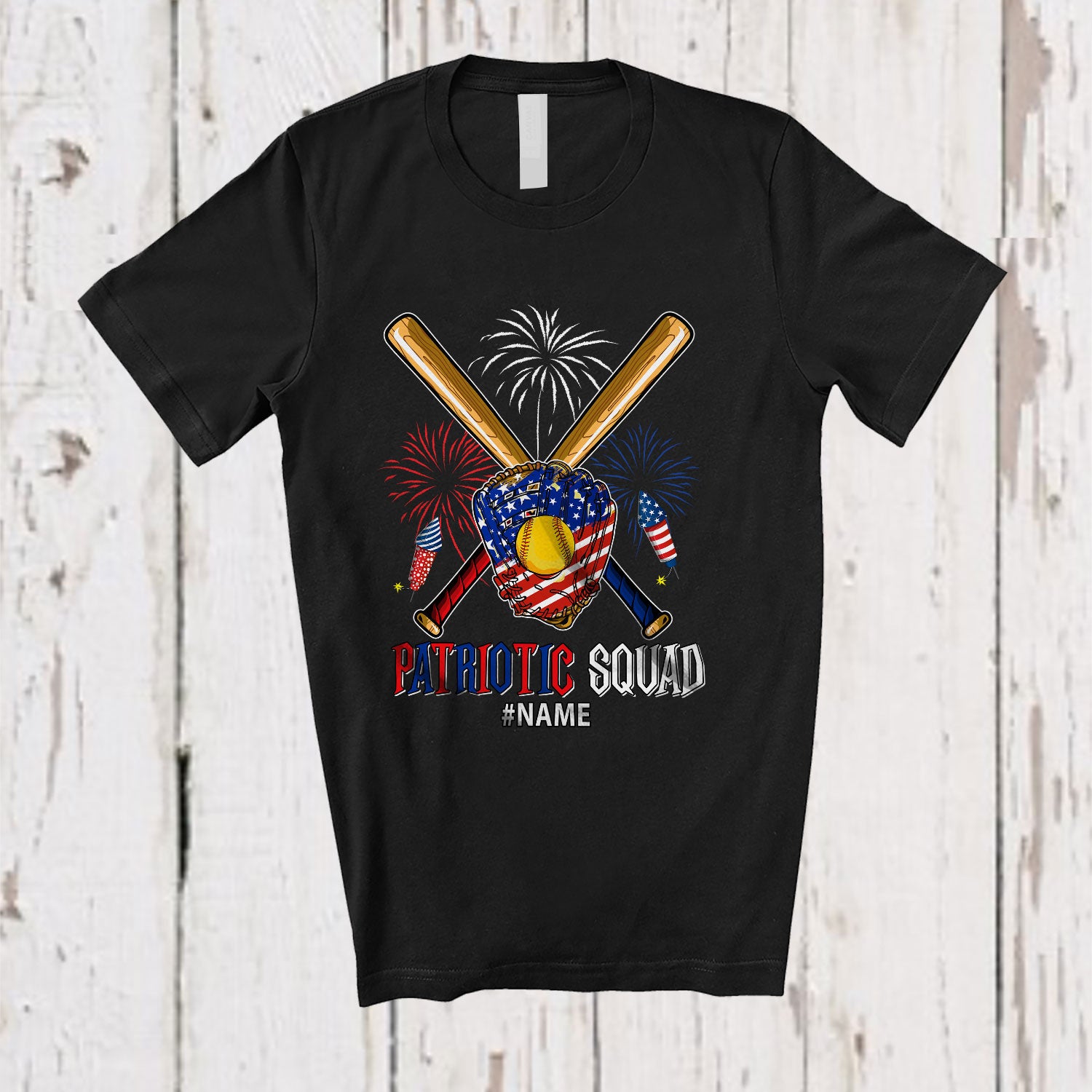 Personalized Patriotic Squad; Amazing 4th Of July Custom Name Softball Player Glove Sticks T-Shirt. This cotton t-shirt is a durable staple product with a classic fit. One of the most popular items, it has a relaxed style made for everyday and casual wear.