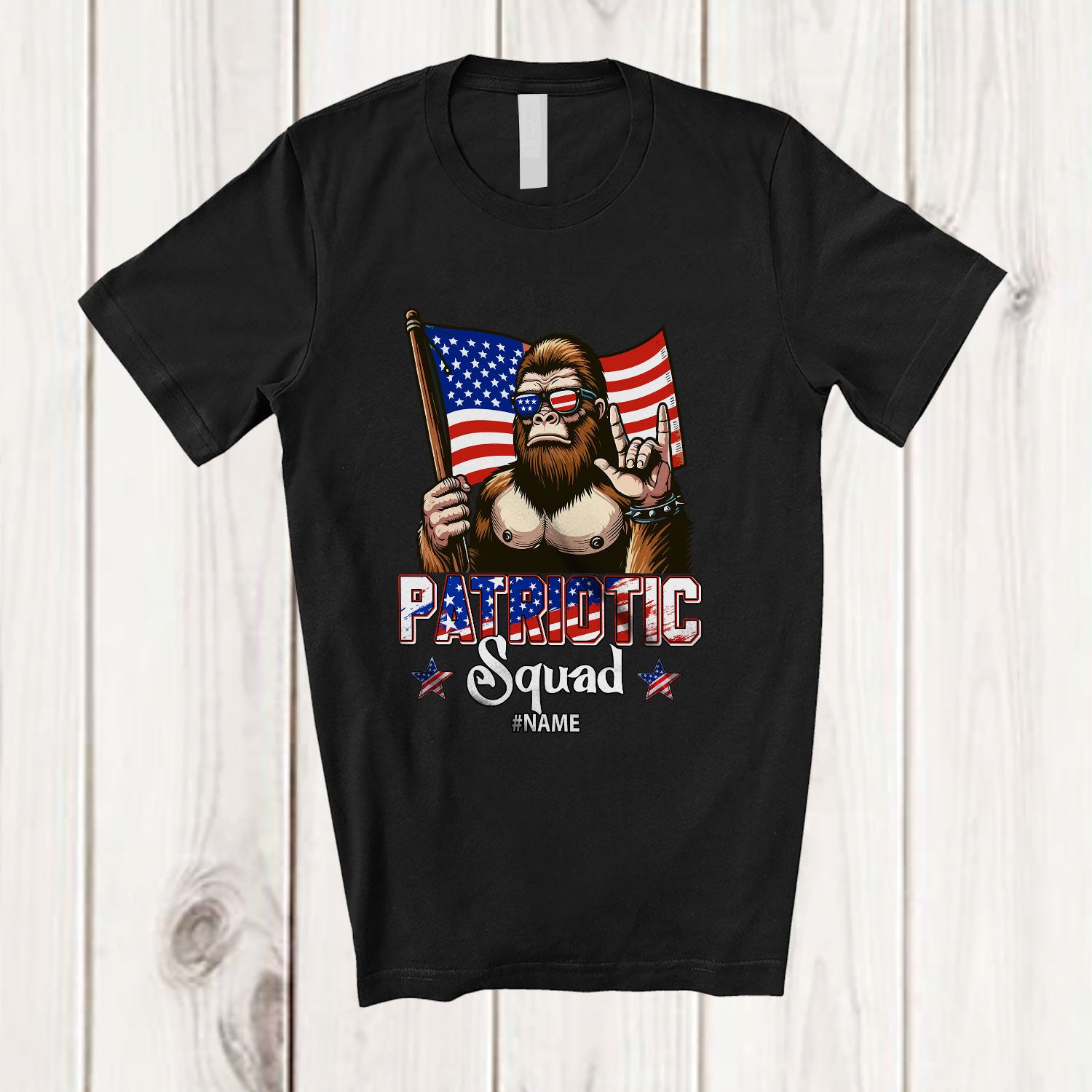 Personalized Patriotic Squad; Humorous 4th Of July Bigfoot Rock US American Flag; Family Group T-Shirt