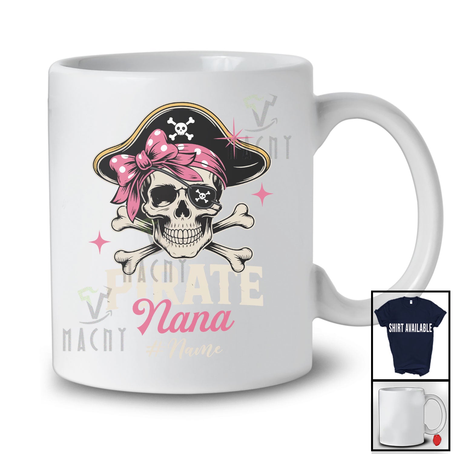 • Personalized Pirate Nana; Scary Halloween Coquette Bow Tie Skull; Custom Name Women Family T-Shirt. This cotton t-shirt is a durable staple product with a classic fit. One of the most popular items, it has a relaxed style made for everyday and casual wear.