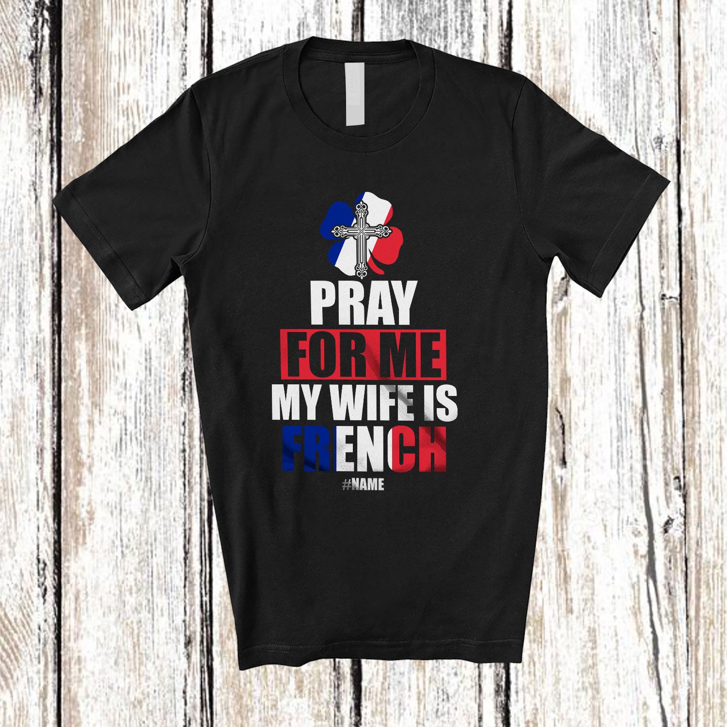 • Personalized Pray For Me My Wife Is French; Proud St. Patrick's Day Custom Name French Cross T-Shirt. This cotton t-shirt is a durable staple product with a classic fit. One of the most popular items, it has a relaxed style made for everyday and casual wear.