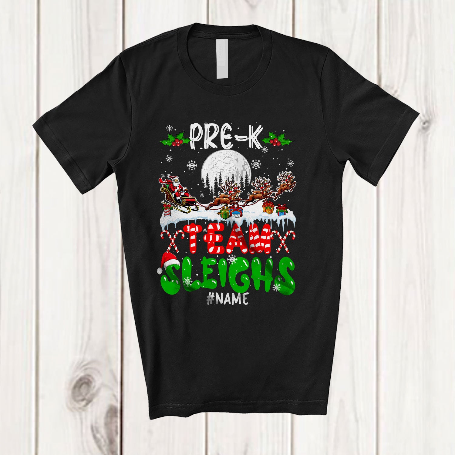 Personalized Pre-K Team Sleighs; Joyful Christmas Santa Sled Reindeer; Custom Name Teacher T-Shirt